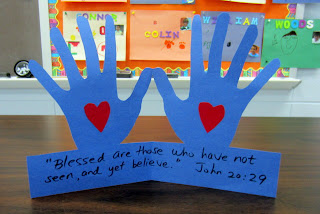 a) Children could make a banner for the classroom or a bulletin board that says, “Blessed are those that do not see, but still believe. John 20:29”-or whatever verse or message they pick that they feel tells the story. What illustrations would they want to decorate it with? I’m sure they’d have ideas.