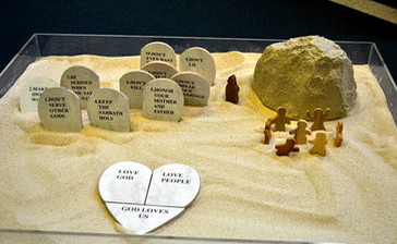 I take out the heart-shaped box that holds the ten stones, and I tell them the story about Moses and Mount Sinai. Before I share each commandment, I give a summary: Love God. Love people. God loves us. Everybody nods.